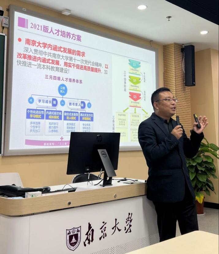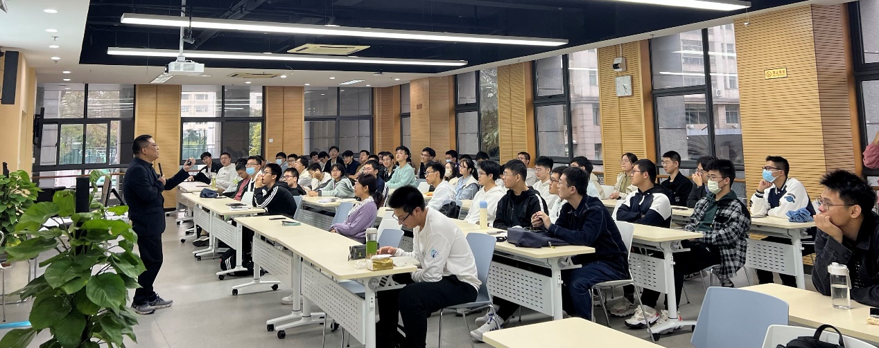 课程学习和修课方案作为同学们在大学期间最为关心的因素之一,对同学们的毕业和继续学习有着举足轻重的作用。俞寿云特别为拔尖计划和强基计划的同学们介绍了各自的专业课程构成、总学分计算机制、以科研项目为载体的课程,希望同学们在参与科学实践的同时提升自身能力,提高自身素质。另外,他还详细地介绍了综合评价成绩单的三部分构成,介绍了“不止看成绩”的评价体系,激励同学们在学术道路上不断前行的同时成为更全面发展的创新性人才。考虑到大一新生对老员工活的各种迷茫和问题,他还由浅入深,结合实例,为同学们比较了大学和高中的区别,介绍了大学这样一个“老师和员工一起创造知识的地方”,用幽默风趣的语言为同学们指明了前路,为还处在迷惘期的新生提供了建议,用自身经验为同学们点亮一盏明灯。