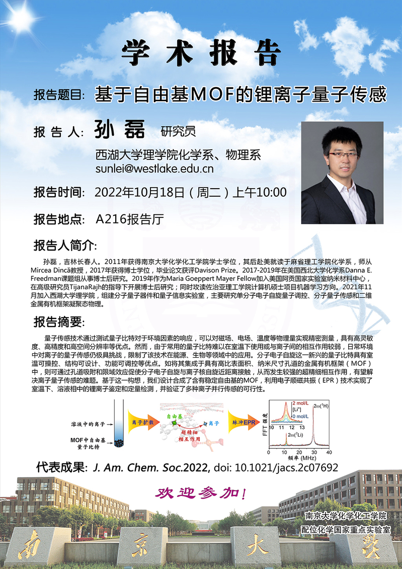10月18日:西湖大学 孙磊研究员:基于自由基MOF的锂离子量子传感