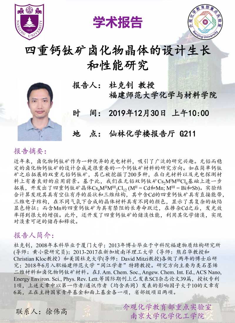 12月30日杜克钊教授:四重钙钛矿卤化物晶体的设计生长和性能研究