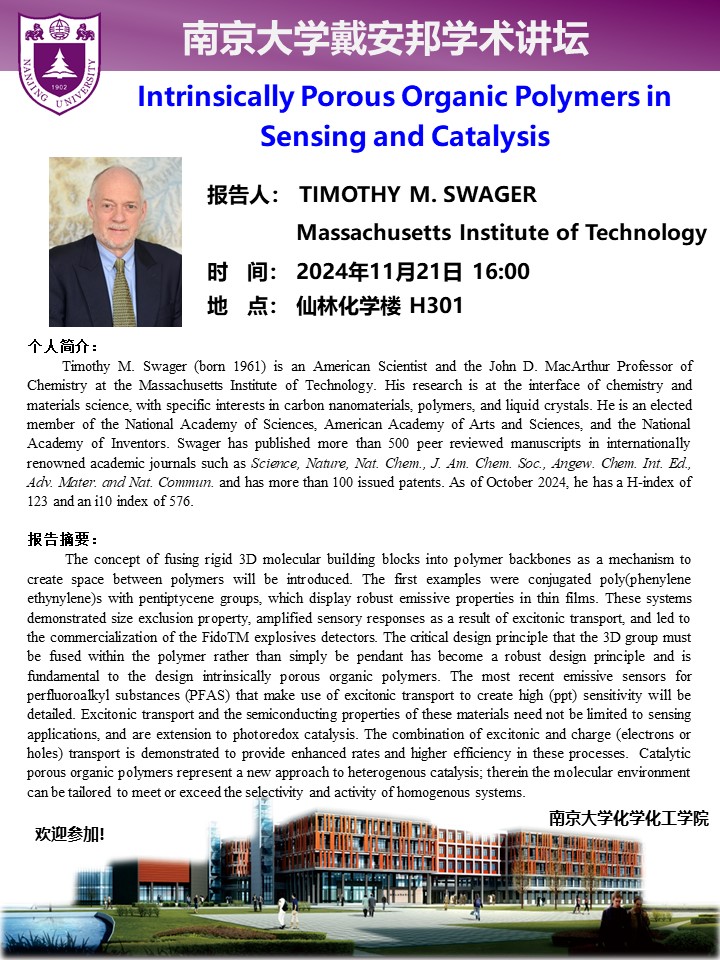 11月21日戴安邦学术讲坛-Timothy M. Swager: Intrinsically Porous Organic Polymers in Sensing and Catalysis