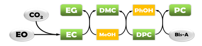CO2捕集、利用与封存(CCUS)技术,是我国实现双碳战略的主要途径之一,而对收集到的CO2进行高值化利用,不仅可减少碳排放、缓解温室效应,还能产生显著的社会经济价值。传统的CO2资源化利用的目标产品附加值较低,近年来,使用CO2直接转化为碳酸酯类产品的研究引起了极大关注,碳酸酯系列产品可作为锂离子电池电解液的优良溶剂,应用前景十分广泛。随着我国新能源产业的迅猛发展,作为锂离子电池电解液溶剂的碳酸酯类产品需求一直在增大,价格也稳步上涨。因此,围绕绿色低碳可持续发展关键技术的需求,大力推进CO2高值化利用转化为锂电池电解液溶剂碳酸酯类产品,将CO2高值化资源利用与新能源产业紧密结合,对形成与碳达峰碳中和目标相适应的低碳转型发展具有重大意义。