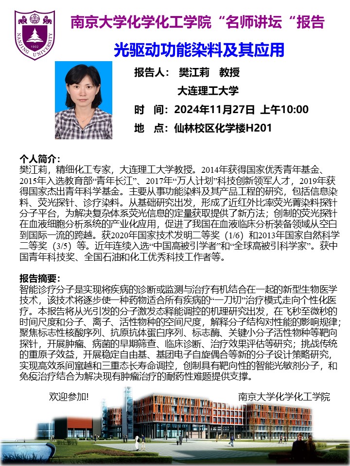 11月27日名师讲坛-樊江莉教授:光驱动功能染料及其应用