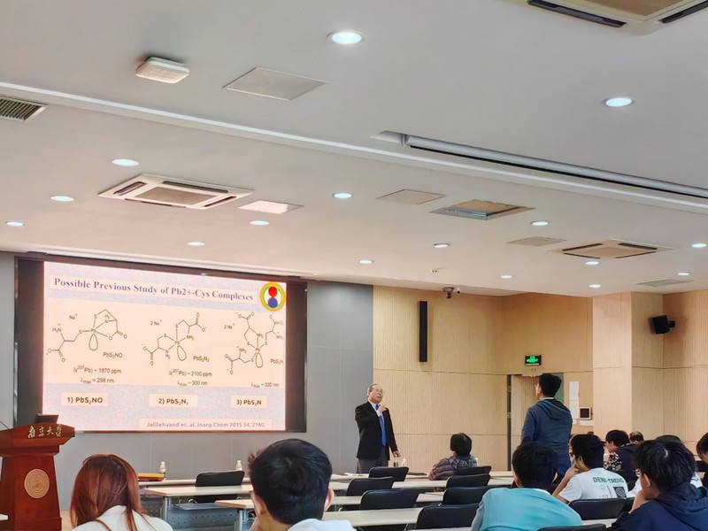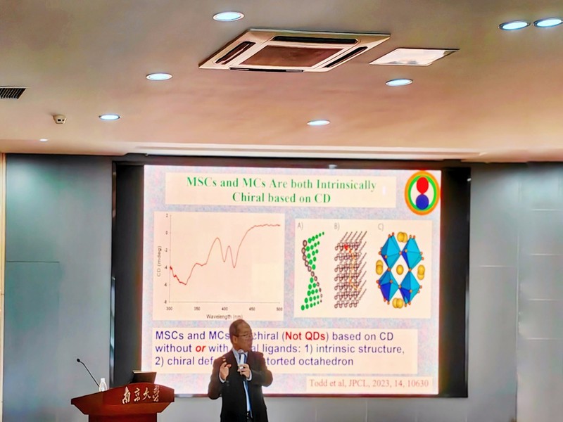 张金中教授分享了关于金属卤化物钙钛矿纳米结构的光电性质的最新前沿研究,这些研究成果对于加深人们在纳米尺度上对材料结构与性质之间关系的理解具有重要意义。张教授从纳米材料的尺寸出发,具体地讲述了在材料在尺寸变化的过程中可能发生的一系列量变与质变现象。例如,他的团队发现,当4 nm的钙钛矿量子点(PQDs)变化为尺寸略小的配体辅助金属卤化物分子团簇(MHMC),再到钙钛矿神奇尺寸团簇(PMSCs)(约1.5 nm)时,量子约束效应(QCE)增强,一些有趣的基本性质也发生了变化。除了预期的吸收和发射蓝移外,光致发光量子产率和激发态寿命普遍随着尺寸的减小而减小,这可能是由于表面缺陷的增加以及电子能带结构随尺寸的变化。此外,PMSCs和MHMC均表现出基于圆二色性(CD)光谱的固有手性,而相应的PQDs则没有。在纳米团簇中观察到的固有手性的可能原因包括扭曲的手性层状结构、手性缺陷或手性八面体。其中,八面体是指与PQDs相比,纳米团簇更大的表面体积比和表面原子百分比引起的扭曲。这些发现在包括自旋电子学和自旋光电子学在内的新兴技术中具有潜在的用途。此外,张教授还比较了这些纳米结构的载流子自旋动力学,发现尺寸、声子和表面对其寿命的影响主要归因于电子-声子和电子-表面散射。讲座现场气氛活跃,师生们积极提问,围绕量子点和分子团簇的各种性质展开了踊跃讨论。