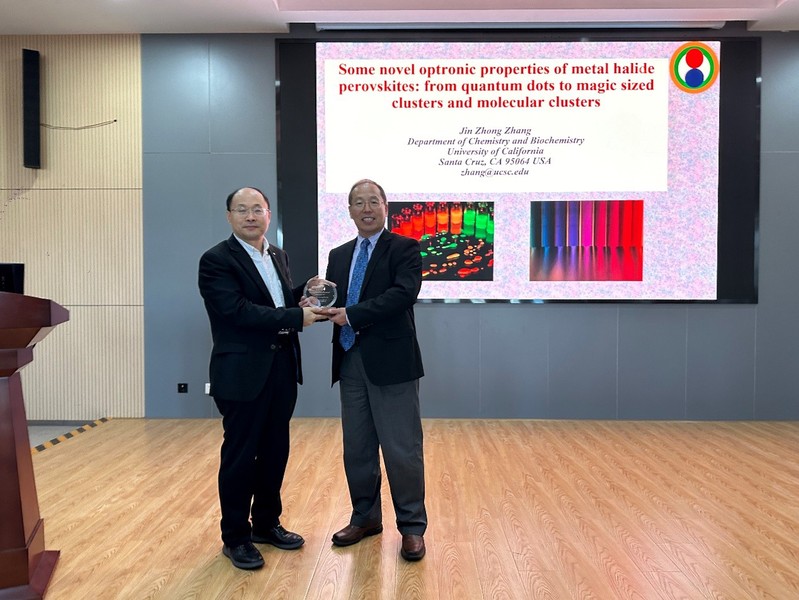 2024年11月14日上午,加州大学圣克鲁斯分校张金中教授应邀作为太阳集团tcy8722“名师讲坛”嘉宾,为公司师生作了题为“Some novel optronic properties of metal halide perovskite nanostructures: from quantum dots to magic sized clusters and molecular clusters”的精彩报告。报告由太阳集团tcy8722夏兴华教授主持。夏兴华教授介绍了张金中教授的简历和成就,太阳集团tcy8722经理黎书华教授向张金中教授颁发了“名师讲坛”纪念铭牌。公司多位教师、员工参加了此次学术报告会。