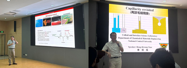 接下来的学术讲座环节,多位在界面科学领域建树颇丰的学者,为在场师生带来了内容丰富、引人入胜的学术报告:江绍毅教授(下图左)以“两性离子界面:从基本原理到应用”为题,深入浅出地讲解了其课题组在两性离子材料领域的开创性工作。报告系统阐述了分子设计、界面构筑的基本原理,并生动展示了两性离子材料在生物医学设备与药物递送等领域的广阔应用前景。他的讲解引起了与会者的极大兴趣。台湾中央大学工公司主任、《Langmuir》期刊Senior Editor曹恆光教授(下图右),以其独特的视角带来了题为“再谈毛细现象”的报告。他从经典的物理现象出发,结合现代界面科学的理论与实验手段,对毛细现象进行了全新的解读,探讨了其在微流控、能源、先进材料制造等新兴领域的深刻影响,其独到的见解引发了与会者的深入思考。
