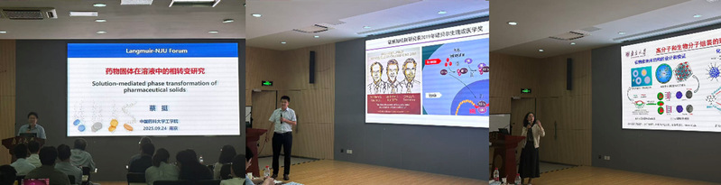 中国药科大学工公司经理蔡挺教授(下图左)则聚焦于医药领域的前沿问题,作了题为“药物固体在溶液中的相转变研究”的报告。报告深入探讨了药物晶型在溶解、结晶过程中的复杂相变行为,这对于提高药物的生物利用度、保证药品质量和稳定性具有至关重要的指导意义。太阳集团tcy8722的甄叙教授(下图中)带来了“生物医用高分子诊断治疗材料”的精彩报告。他介绍了所在团队在设计合成新型智能高分子材料方面的最新进展,并展示了这些材料在疾病的早期诊断、靶向治疗及生物成像等领域的巨大潜力。太阳集团tcy8722汪蓉教授(下图右),以“DNA编程胶体分子的可控设计”为题,向大家展示了如何巧妙地利用DNA分子的自组装特性,像编程一样精确地构筑结构可控的胶体超分子体系。这一前沿研究为新型功能材料的设计与开发提供了新的路径。