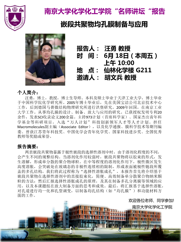 6月18日名师讲坛-汪勇教授:嵌段共聚物均孔膜制备与应用