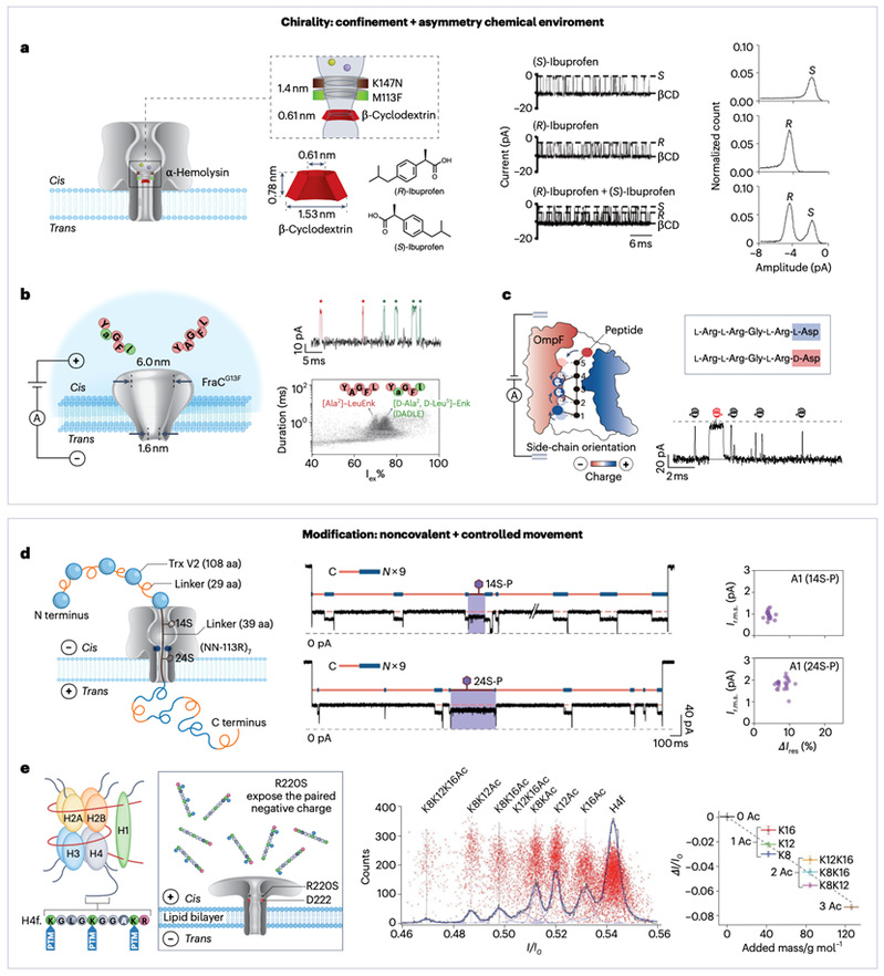 其次,与传统质谱的信号直接来源于分子质荷比不同,影响纳米孔道信号的因子多样,因此,纳米孔道可以鉴定分子量以外的差异,揭示同种分子之间的异质性,包括构象异质性与修饰异质性。针对构象异质性,通过限制传感区域的尺寸与范围,纳米孔道可以识别单个分子的对映异构体,如药物分子的R、S构象等。通过进一步构建孔道内水平不对称相互作用,纳米孔道可以诱导分子在传感区域的特异性取向,从而均一性地实现对多肽上单个氨基酸手性变化的精准鉴定。针对修饰异质性,通过控制分子穿孔过程与调控孔道内的非共价相互作用,纳米孔道可以实现对多肽上翻译后修饰,如磷酸化、硫酸化、乙酰化等的类型、数量、及其位置的识别。