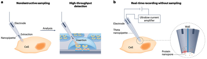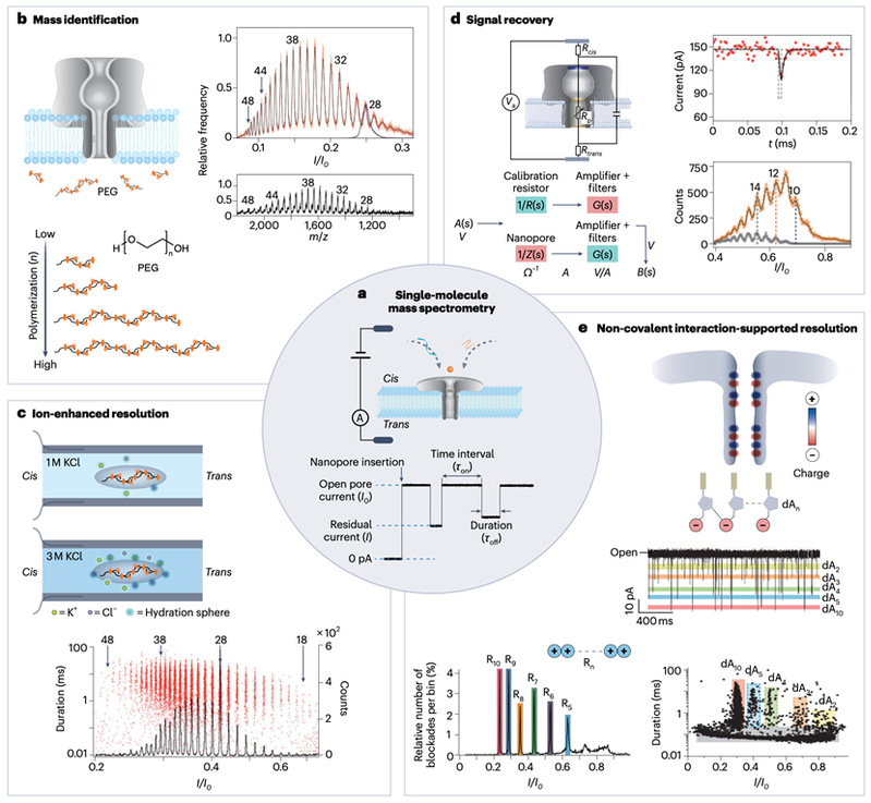 首先,纳米孔道可作为一种“单分子质量读取器”,精准识别单个生物分子(如核酸、蛋白质和多糖)的分子量差异。通过调控分子与离子的结合、分子与纳米孔道的非共价相互作用以及对瞬态离子流信号的还原与解析,可以提升纳米孔道的质量识别分辨率,将对单个组成单元的识别从PEG模型分子拓展到核酸、蛋白质甚至多糖等生物聚合物,甚至可以进一步鉴定生物分子上的单个修饰基团,如DNA损伤、蛋白质翻译后修饰等。此外,纳米孔道对分子的表征不受体系内其他分子的干扰,避免了系综测量的平均效应,因此,其分辨率低于传统质谱,但以单分子检测特征与单基团识别能力,有望发展为一种“单分子组学”技术,可应用于复杂体系中低丰度分子的鉴定与潜在生物标志物的发现。