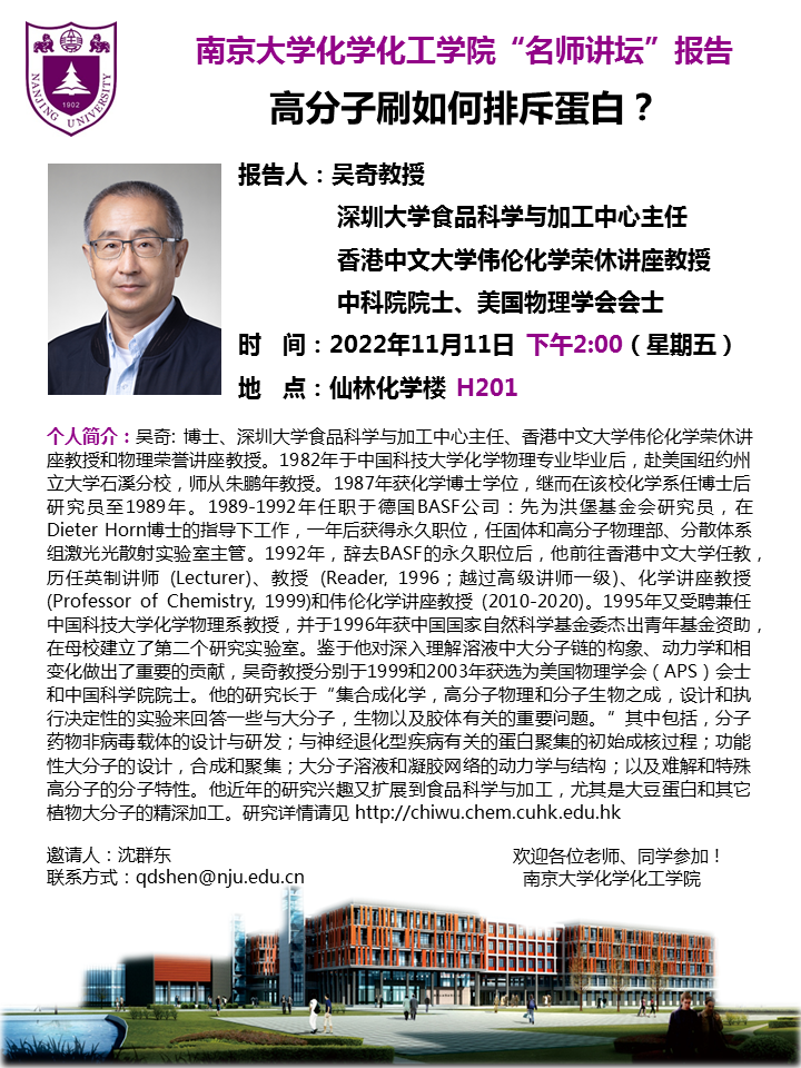 11月11日名师讲坛-吴奇教授:高分子刷如何排斥蛋白?