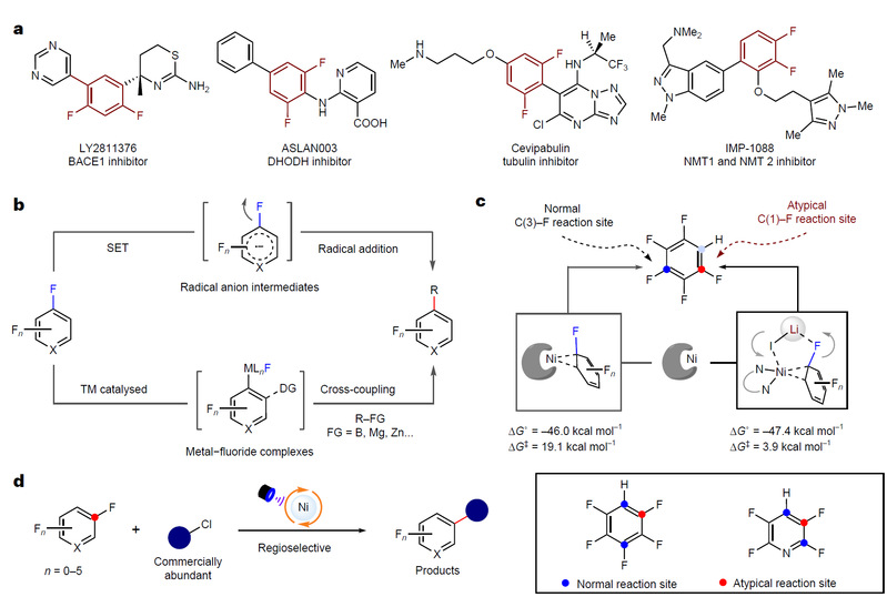 多氟芳烃和多氟杂芳烃在医药、农药和有机材料等领域具有广泛应用(图1a)。近几十年来,通过C-H或C-X键氟化一直是合成氟代芳环的重要方法。尽管这些方法能够高效合成多种单氟芳烃,但它们通常需要预先引入多个官能团或导向基团,因此将这些策略应用于多氟芳烃的合成中存在较大局限。利用廉价易得的多氟芳烃化工品为原料,通过直接脱氟官能团化策略已成为合成复杂多氟芳基化合物的有效方法。这些策略包括芳基亲核取代(SNAr)策略、光催化单电子还原(SET)策略以及金属催化C-F键活化策略等(图1b)。然而,大多依赖于有机锂、格氏试剂等金属亲核试剂的使用,或依赖光催化剂的氧化还原能力,这在一定程度上限制了其应用范围。