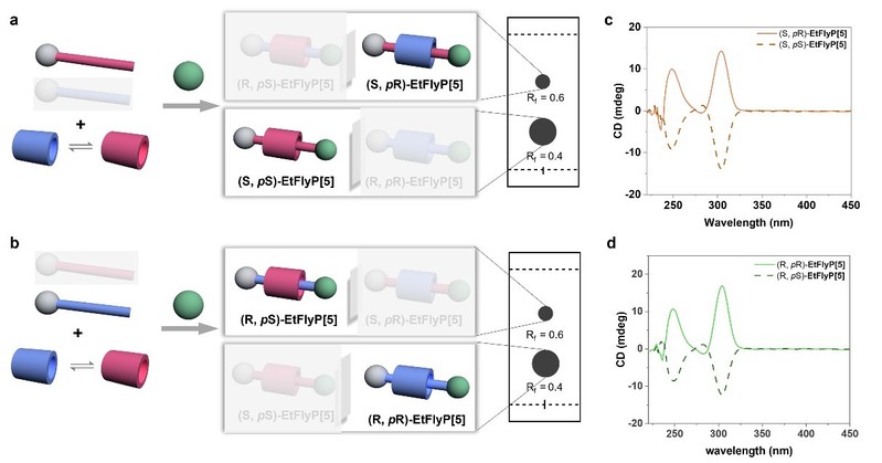 研究人员进一步以手性纯(S)-EtFly和(R)-EtFly为轴合成了手性轮烷,非对映异构体比例约为1:3,显示出明显的立体选择性。圆二色光谱表明,(S, pS)-EtFly与(R, pS)-EtFly 在250 nm和302 nm处表现出负Cotton效应,而(S, pR)-EtFly与(R, pR)-EtFly则显示正Cotton效应。该结果表明,赖氨酸修饰轴兼具手性诱导源与轮烷结构骨架的双重角色。