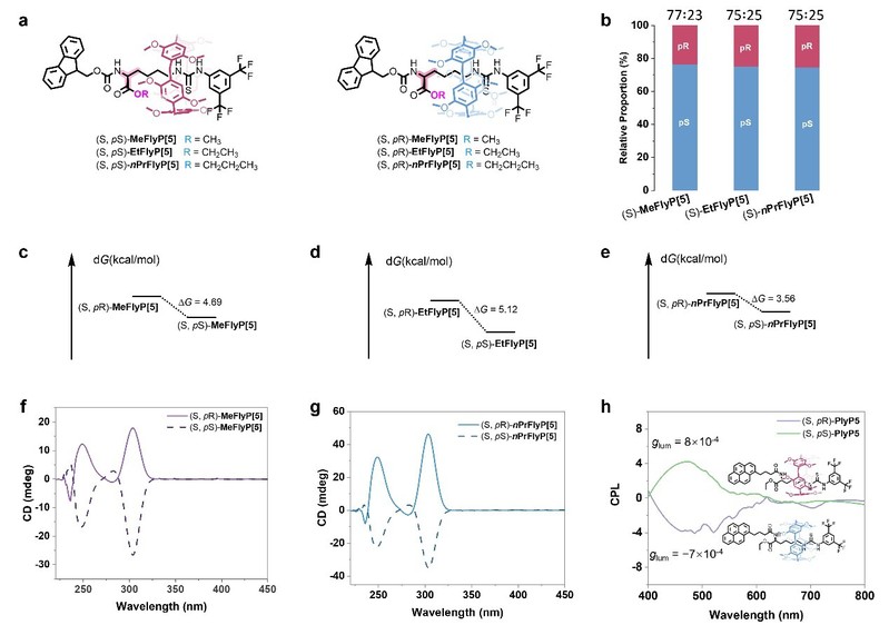 为验证该策略的普适性,研究团队还尝试了其他烷基链取代的轴单元(如MeFly和nPrFly),结果表明S构型轴与pS大环结合能形成更稳定的轮烷结构,理论计算显示其能量比非优势立体结构低3.56–5.12 kcal/mol。此外,该策略还被成功拓展至功能型轮烷的构建。通过引入芘发光团,团队合成了具有圆偏振发光(CPL)特性的手性轮烷,在470 nm处表现出明显的CPL信号,实现了从分子手性到圆偏振发光功能的有效传递。这一轴-环诱导策略不仅为基于DMP5A的手性轮烷提供了产物无需手性拆分的合成方法,也为合成从轮烷到索烃乃至更复杂的拓扑结构的手性机械互锁分子与手性材料提供了创新思路。