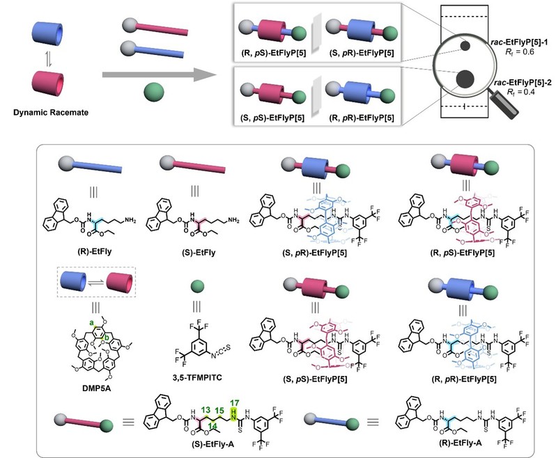 首先,研究团队以外消旋赖氨酸衍生物(rac-EtFly)修饰的轴分子与大环分子DMP5A组装,成功构建了轮烷。该轮烷体系同时具备来自赖氨酸的静态点手性和来自柱芳烃大环的动态平面手性,理论上可形成两对对映体。实验结果表明,通过薄层色谱可清晰观察到两个产物点,分别对应两种轮烷异构体rac-EtFlyP[5]-1和rac-EtFlyP[5]-2,且两者可通过常规硅胶柱色谱实现高效分离。高分辨质谱、核磁共振波谱及单晶X射线衍射分析共同证实,rac-EtFlyP[5]-1由(S, pR) 和(R, pS) 构型组成,而rac-EtFlyP[5]-2则由(S, pS) 和(R, pR) 构型组成。¹H NMR中轴质子显著的高场位移表明大环对轴组件产生屏蔽效应,NOESY谱中观察到硫脲质子与DMP5A芳香质子之间的空间邻近信号,证实了轮烷的有效形成与空间关系。单晶结构解析显示,(S, pS)构型中轴呈特征性的L型弯曲(88.5°),使得芴基更靠近大环,并通过更强的氢键和C–H···π作用稳定其结构,从而解释了该构型更高产率的实验现象。