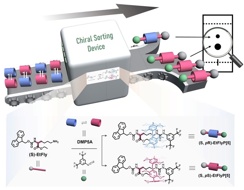 手性轮烷作为机械互锁分子家族的重要成员,在不对称催化与智能材料等领域展现出广阔前景。美国西北大学/中国香港大学Stoddart团队,英国曼彻斯特大学Leigh团队、中国华东师大杨海波团队、英国伯明翰大学Goldup团队、德国杜伊斯堡-埃森大学Niemeyer团队、日本京都大学Ogoshi团队等取得了卓越的成果;其中,基于具有动态pR/pS平面手性的柱[5]芳烃这一类大环主体所构建的轮烷体系,因其特殊的平面手性,尤其适于发展手性传感、圆偏振发光等功能材料。通过修饰轴组分可实现对轮烷结构的精准调控与功能化拓展。然而,该类轮烷的合成与纯化主要依赖手性色谱分离,由于其步骤繁琐、成本高昂且难以放大,严重制约了其实际应用与系统开发。