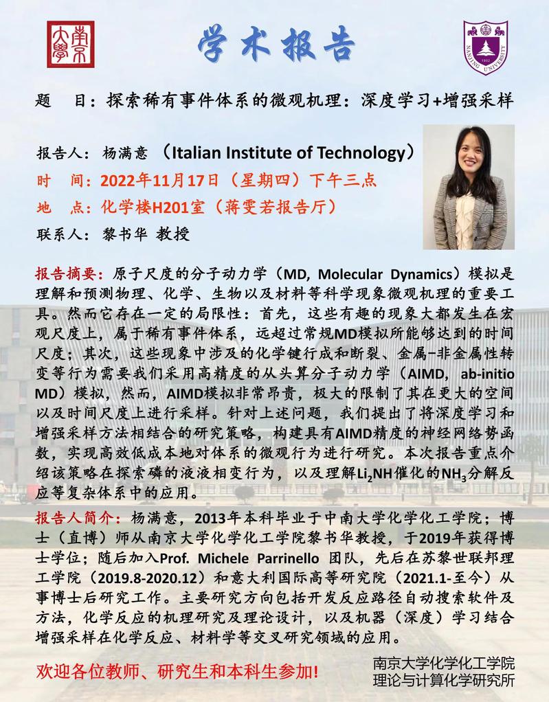11月17日:意大利国际高等研究院杨满意:探索稀有事件体系的微观机理:深度学习+增强采样