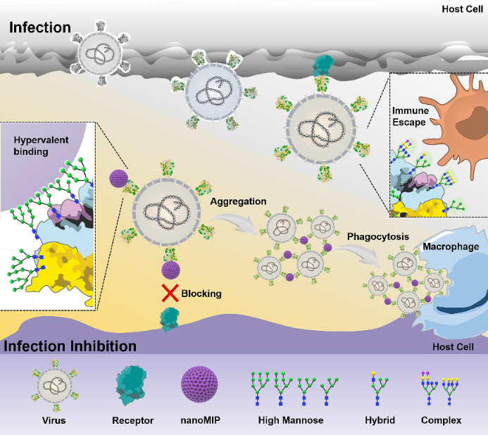 为了将课题组多年积累的仿生分子识别技术用于解决新冠疫情面临的重大社会需求,刘震教授在疫情爆发初期就迅速动员和组织团队、深入调研、积极攻关,并和校外抗病毒研究优势团队展开充分的合作,致力于发展创新的广谱高效的抗病毒制剂。团队首先发展出能结合高甘露糖的核酸适配体,并在此基础上发展出对新冠病毒(SARS-CoV-2)假病毒展现出了一定的广谱病毒抑制能力的多价结合高甘露糖的树突状适配体和核酸四面体纳米结构(CCS Chemistry, 2022, DOI: 10.31635/ccschem.022.202101747)。此外,该团队还开发出与新冠病毒表面刺突蛋白的拓扑结构相匹配的DNA纳米皇冠,实现对新冠病毒野生株和多个重要变异株均的高效抑制(CCS Chemistry, 2022, DOI: 10.31635/ccschem.022.202201945)。尤为重要的是,利用自主知识产权的先进分子印迹技术(Angew. Chem. Int. Ed. 2015, 54, 10211-10215; Nat. Protoc. 2017, 12, 964-987;Adv. Sci.2021, 8, 2101713),该团队在克服印迹模板合成困难等一系列挑战之后,发展出一种能够超多价结合高甘露糖的纳米人工抗体(纳米分子印迹聚合物,nanoMIP)。通过靶向病毒的“糖盾”,该纳米人工抗体不仅能够阻断病毒-受体相互作用,还能够诱导病毒聚集并促进巨噬细胞的吞噬清除作用,对具有高甘露糖的病毒,包括艾滋病毒、拉沙热病毒和新冠病毒(SARS-CoV-2)及其重要变异株(如德尔塔和奥米克戎)均展现出强效和广谱的抑制作用。该结合“糖盾”的纳米人工抗体为进一步发展广谱病毒抑制和新型疫苗佐剂等提供了全新的策略和技术路径。