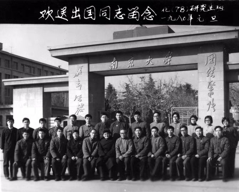 1980年元旦,化学系系主任等和78届研究生欢送薛奇等出国留学在校门口留影
