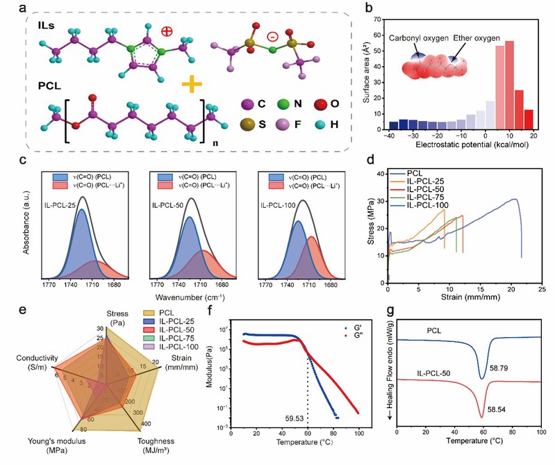 该工作创新性地将离子液体(IL, [BMIM]TFSI)作为导电填料,融入商业化的热塑性高分子聚己内酯(PCL)基体中(图1)。相较于传统的刚性无机填料,液态的离子液体不仅赋予了材料优异的离子导电性(为损伤“感知”提供电信号基础),更通过离子-偶极相互作用构建了动态交联网络,保证了材料的柔韧性。通过系统的实验优化,团队发现当离子液体含量为~33.3 wt%(IL-PCL-50)时,材料在机械强度、韧性与导电性之间达到了最佳平衡。该材料的熔点约60℃,这一热响应特性使其能够通过精准的局部加热实现高效的损伤修复。