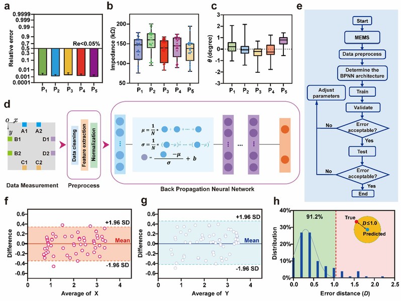 为了赋予材料精准的“痛觉”,团队开发了一种高灵敏度的八端口阻抗测量方法。该方法可在材料表面采集28维的复杂阻抗向量,如同一个精密的“神经传感网络”,能够实时捕捉由损伤引起的微弱电信号变化。这些高维数据被输入到一个经过深度学习训练的反向传播神经网络(BPNN)模型中。该AI模型扮演着系统“大脑”的角色,能够从复杂的电信号“指纹”中解码出损伤的精确空间坐标,其预测精度高达R² = 0.987(x坐标)和R² = 0.977(y坐标),为后续的精准“治疗”提供了可靠导航。