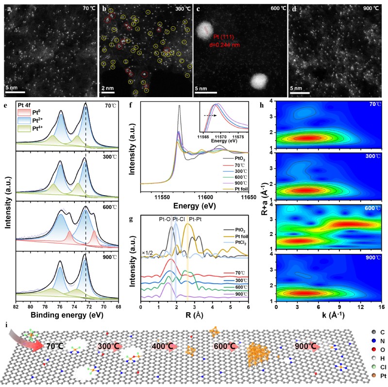 图 1. 典型Pt/hNCNC-T (T=70、300、600和900℃)的形貌和结构。(a-d) Pt/hNCNC-70℃(a),-300℃(b),-600℃(c),-900℃(d)的HAADF-STEM图像。(b)中的黄色和红色圆圈分别表示Pt位点相邻的双原子和多原子。(c)中是两组衍射点的快速傅里叶变换(FFT)图,对应于Pt的(111)和(200)面。(e) Pt 4f的XPS光谱。(f) Pt L3边的归一化XANES光谱,插图是局部放大图。(g) 傅里叶变换k3加权EXAFS光谱。(h) Pt L3 EXAFS小波变换图。(i)Pt随温度的结构演变示意图。