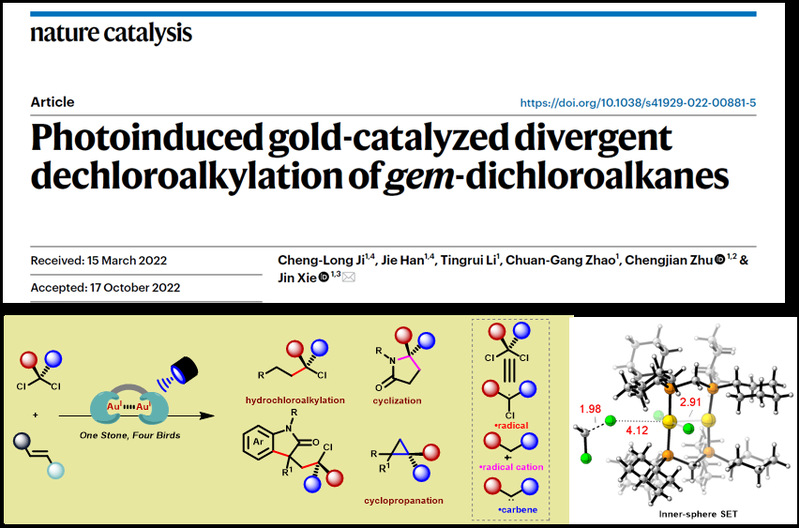 本研究发展了基于内层单电子转移机制的激发态下双核金催化偕二氯烷烃的可控脱氯烷基化反应,实现了不同烯烃参与的氯烷基化、氯烷芳基化和环丙烷化反应。上述研究工作得到了国家自然科学基金((22122103, 21971108, 22101130, 21971111, 21732003)、国家重点研发计划(2022YFA1503202,2021YFC2101901)江苏省自然科学基金(BK20190006)、中央高校基本科研业务费专项(020514380252, 020514380272)、配位化学国家重点实验、江苏省先进有机材料重点实验室和化学与生物医药创新研究院(ChemBIC)的支持。