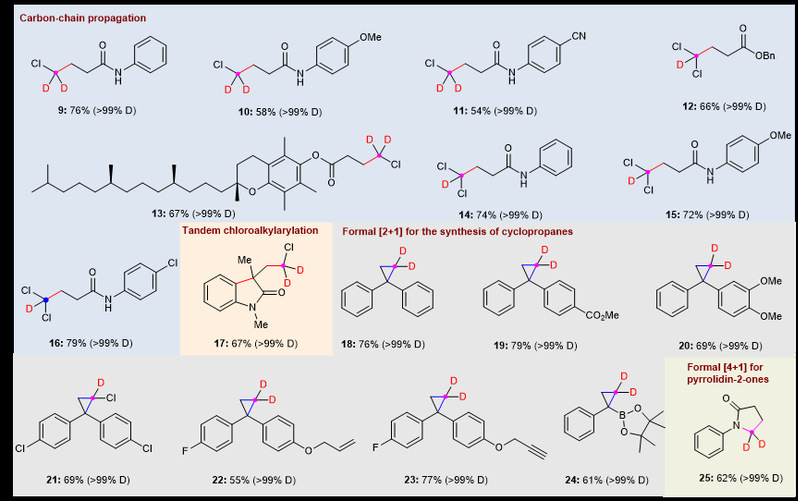同时,该方法具有克级制备能力,并能成功运用于多种复杂药物分子和天然产物衍生物的脱卤烷基化修饰。商品化的氘代二氯甲烷在该策略下也可以直接作为相应的氘代试剂,发生可控的脱氯烷基化反应,快速制备系列含氘的化合物,有望在有机合成、生物医药领域进一步应用。
