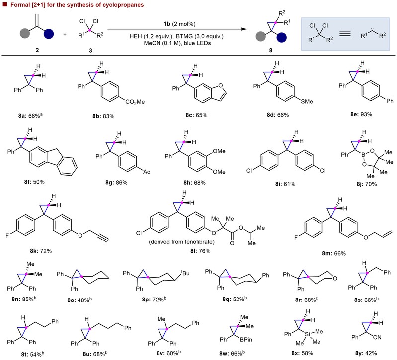 特别值得一体的是,经典的Simmons-Smith环丙烷化反应往往都需要使用到不稳定的偕二碘烷烃,而该激发态双核金策略可以直接使用来源更广、更稳定、操作更简便的偕二氯烷烃作为烯烃的环丙烷试剂,是对Simmons-Smith环丙烷化的一个扩展与补充。