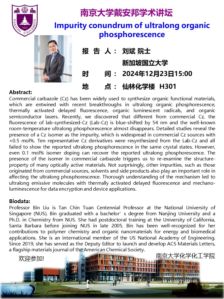12月23日戴安邦学术讲坛-刘斌院士:Impurity conundrum of ultralong organic phosphorescence