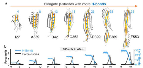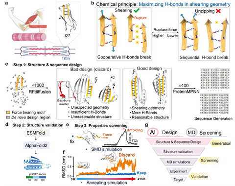 自然界中的肌联蛋白等凭借其β-折叠片内密集的氢键网络,展现出卓越的机械性能。受此启发,郑鹏教授团队基于在“AI+蛋白质”设计领域的长期积累,开发出一套由AI驱动的计算设计新方法。该方法通过系统性优化与延伸β-折叠链结构,最大化主链氢键网络,从而实现了对蛋白质力学性能的“按需定制”。基于此策略,团队成功从头设计出名为“SuperMyo”的超稳定蛋白质,其性能远超天然同类蛋白。