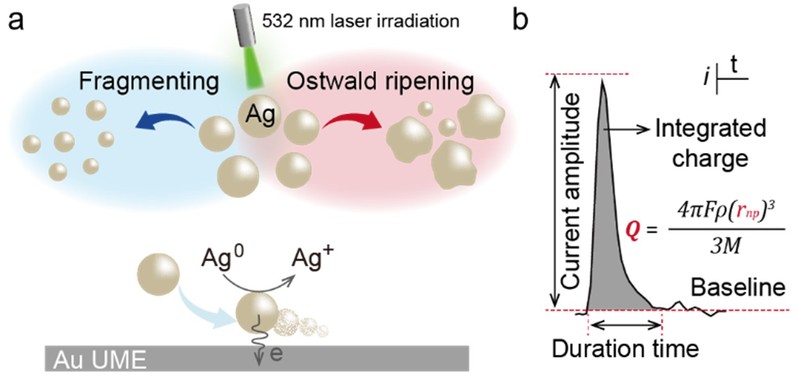 图1. (a)随机碰撞电化学技术实时、原位追踪光诱导银纳米颗粒形貌演变示意图。