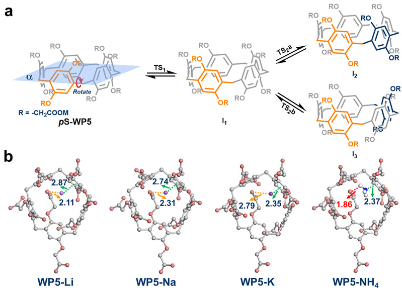 作者进一步通过理论计算研究WP5-Li、WP5-Na、WP5-K、WP5-NH4势能面上翻转一个芳环(TS1)和翻转第二个芳环(TS2)的过渡态结构。过渡态区域结构的相对能量顺序为WP5-Li > WP5-Na > WP5-K > WP5-NH4,这与实验测定的能垒趋势定性一致。此外,通过对势能面扫描图中提取的能量最高点的结构进行分析,发现阳离子与柱芳烃间位的芳环存在由WP5-Li到WP5-K逐渐增强的阳离子-p作用。WP5-K与WP5-NH4的阳离子-p作用强度近似,而NH4+与柱芳烃侧链的羧基有氢键作用,这导致WP5-NH4的能垒低于WP5-K。