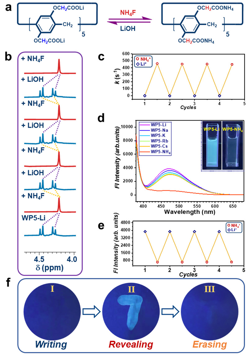 在充分探究了阳离子对WP5旋转能垒的影响后,作者通过阳离子切换,对WP5转子的旋转速度进行调控。在WP5-Li的核磁谱图(298 K,D2O)中柱芳烃侧链亚甲基的氢裂分成两个二重峰,这表明WP5转子缓慢转动;向体系中加入氟化铵,沉淀除去锂离子,并引入润滑剂铵离子,WP5的转动加快,WP5侧链亚甲基氢的核磁信号变成单峰;继续向体系中加入氢氧化锂,同时鼓入氮气以除去润滑剂铵离子,甲基的氢又恢复双峰,转子的旋转速度被抑制。该调控可以进行多次循环。