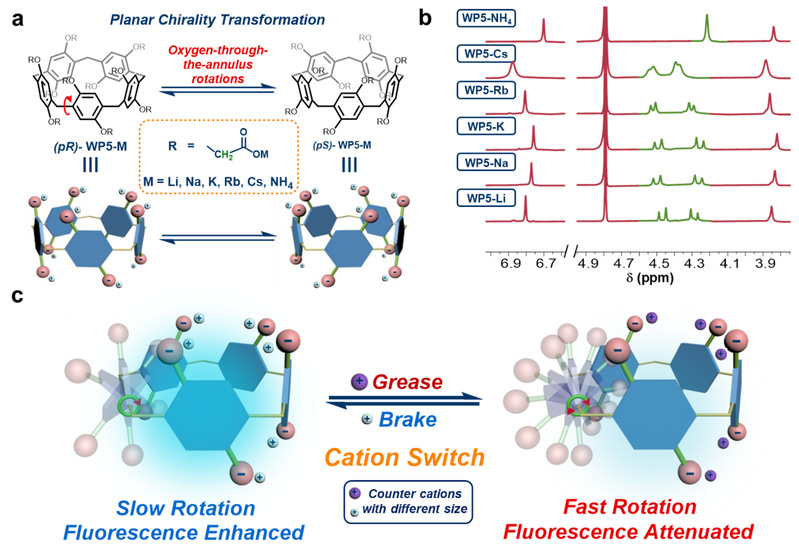 近期,强琚莉、林晨课题组与马晶教授课题组合作报道了一类通过抗衡阳离子调控的基于阴离子型柱芳烃(WP5-M)骨架构筑的分子转子平台,成功实现了对柱芳烃中芳环旋转运动的精确调控,通过对于柱芳烃芳环基元微观运动的调控,构建了新型荧光开关,并拓展了其在防伪墨水方面的应用。
