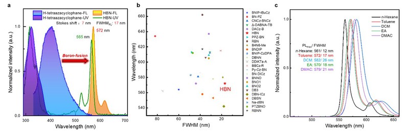 实验结果显示,与四氮杂环烷前体相比,双硼嵌入实现了高达165 nm的发射光谱红移(图2)。同时,HBN在甲苯稀溶液中表现出572 nm的超窄带黄光发射,光谱的FWHM只有17 nm,而在正己烷中发射光谱的FWHM进一步缩窄至12 nm,刷新了当前中长波长区域的窄光谱纪录。