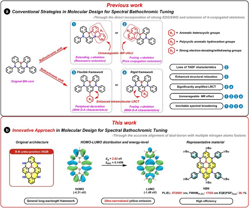 用于超高清显示技术的有机发光二极管(UHD-OLED)对其发光材料的光谱宽度需求由较高要求,光谱窄化这一技术瓶颈的解决是满足广色域(BT.2020)行业显示标准的关键,并可以借此显著提升终端显示效果。窄带多重共振型热激活延迟荧光(MR-TADF)材料作为当前显示终端材料端口的高效解决方案,在过去十年间取得了显著进展。尽管现有大多数MR-TADF材料能够实现一定程度的窄带发射(半峰宽FWHM< 50 nm),但能够实现FWHM小于20 nm的超窄带发射的材料仍属罕见,且这些材料几乎仅限于蓝光至绿光区域,难以覆盖长波长范围。此外,超窄带长波长发光材料领域缺乏高性能的分子设计框架,因此,如何同时实现光谱窄化与红移已成为学术界和工业界亟待突破的核心难题。