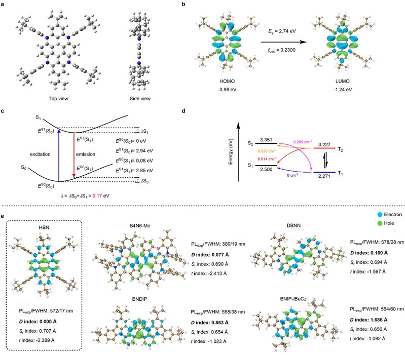 理论计算表明,HBN分子具有高度对称和平面的分子结构(图3a),HOMO与LUMO轨道同样具备对称性(图3b)。其低结构重组能(0.17 eV)表明分子具有较低的结构弛豫特性(图3c)。此外,HBN的理论单三线态能级差(ΔEST = 0.23 eV)也与实验值(0.22 eV)高度吻合(图3d)。进一步的理论电子-空穴分析表明,电子-空穴中心间距(D指数)的增加会显著影响发射光谱的半峰宽,特别是在纯红光区域,这一现象揭示了LRCT性质对材料光谱的关键影响(图3e)。
