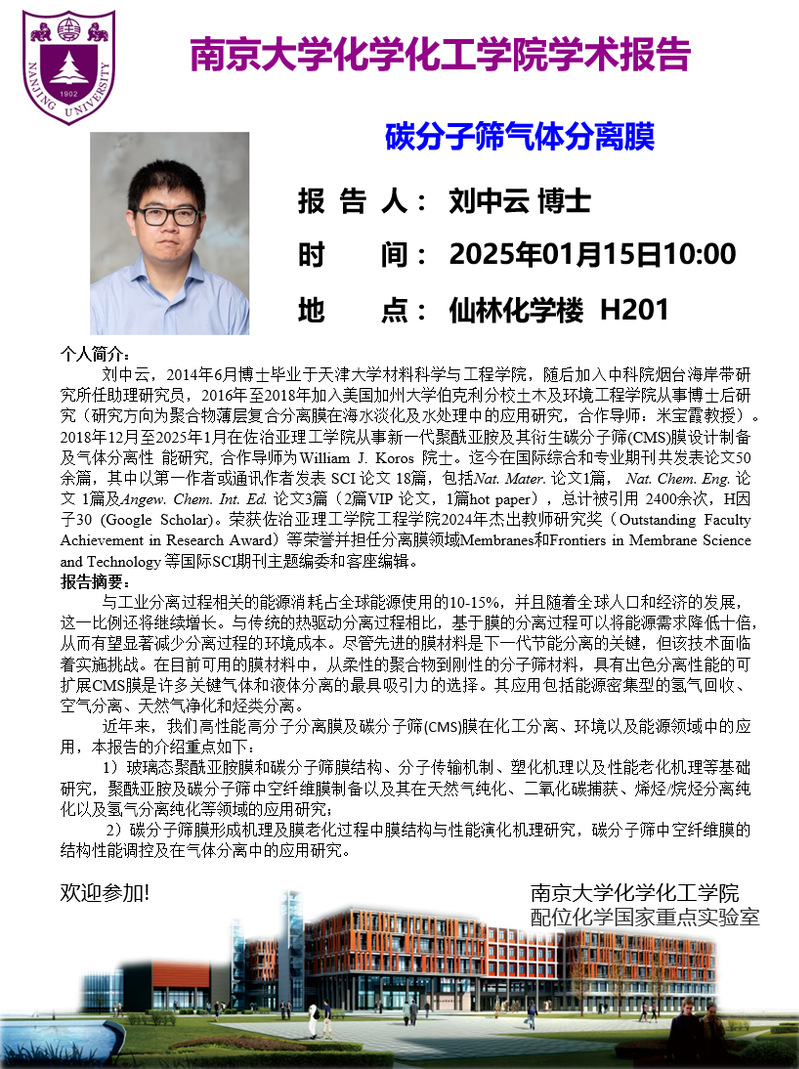 1月15日学术报告-刘中云博士:碳分子筛气体分离膜