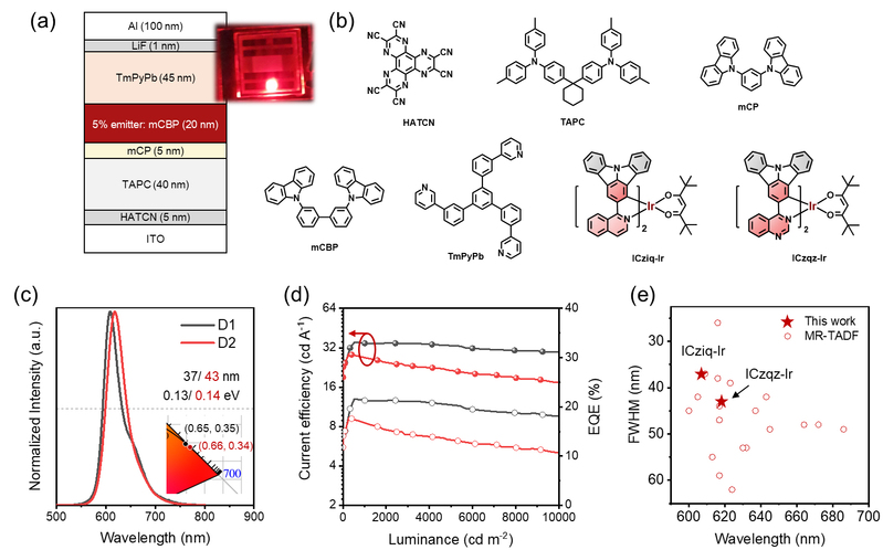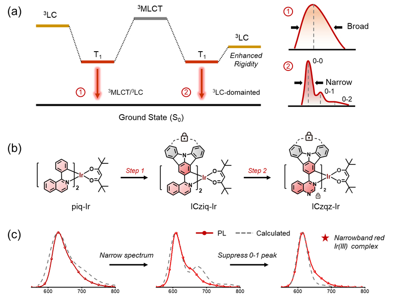 有机发光二极管(OLED)作为一种主流的平面显示技术,受到了企业界和学术界的广泛关注。铱配合物由于其较短的磷光寿命、较高的量子产率以及易调节的发光颜色,已经在商用的绿光和红光OLED材料方面取得了巨大的成功。然而,铱配合物普遍存在的发光谱较宽、色纯度较差的问题,严重制约其在高清、高色域显示面板中的应用。虽然当前热门的多重共振热活化延迟荧光(MR-TADF)材料可以显示窄谱带发射和高发光效率,但是其较长的三线态寿命会导致相应的OLED器件效率滚降非常的严重。目前针对铱配合物光谱窄化及其内在原理的深入探究相对匮乏,阻碍了磷光铱配合物的应用升级。