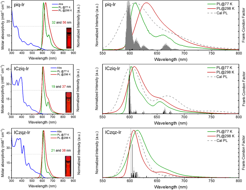 从理论计算模拟中可以看出,MLCT能级过多的参与,激活了参比配合物piq-Ir的低频振动,使得大量的低频振动参与到发射过程中,进而导致较宽的发射光谱。而刚性修饰后的ICziq-Ir和ICzqz-Ir中更多LC能级参与抑制了低频振动耦合到磷光发射过程,使得0-0发射峰明显窄化。其中,ICzqz-Ir对于高频振动的进一步抑制,降低了电子跃迁过程中的高频振动耦合,从而基本消除0-1发射峰。理论计算结果成功解释了铱配合物光谱窄化的内在原理,为设计高色纯度磷光铱配合物提供了理论基础。