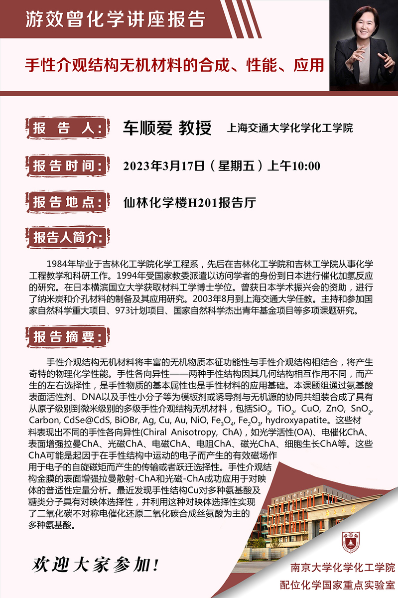 3月17日:上海交通大学车顺爱教授:手性介观结构无机材料的合成、性能、应用