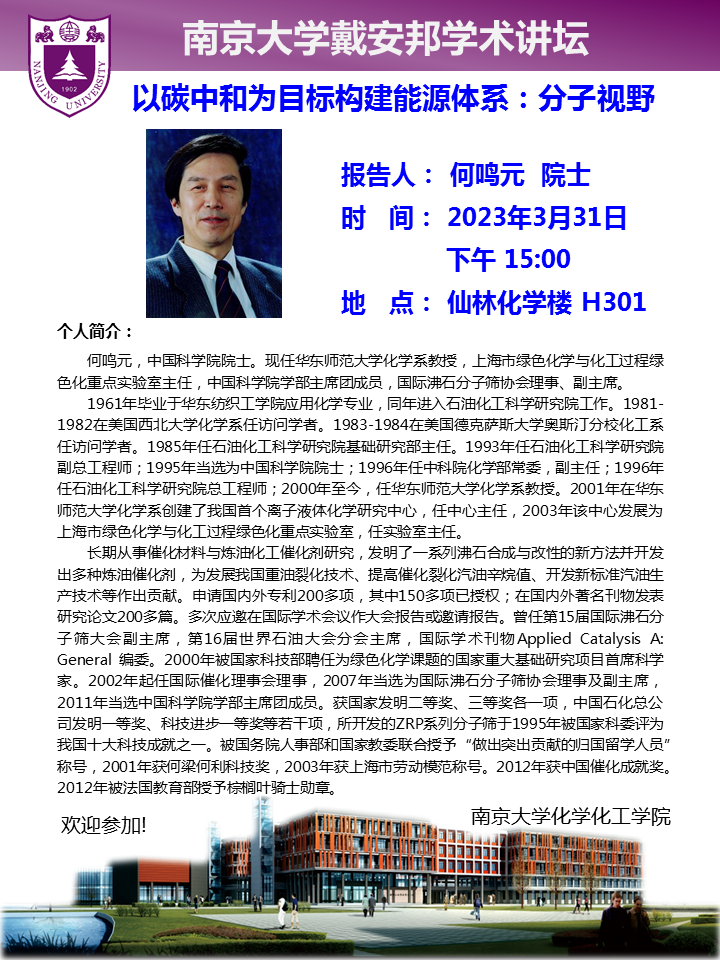 3月31日戴安邦学术讲坛-何鸣元院士:以碳中和为目标构建能源体系:分子视野
