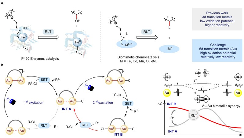 自由基配体转移是自由基官能化的重要策略之一,其核心机制在于烷基自由基从高价金属物种中捕获配体,进而高效构建碳-杂键。尽管3d过渡金属(如铁、钴、锰、铜等)介导的自由基配体转移过程已有研究,但5d过渡金属(如金)在该反应体系中的应用仍相对处于空白。太阳成集团谢劲课题组提出“连续激发”策略,通过动态“Au-Au”键调控实现未活化C(sp³)-Cl键(如二氯甲烷、氟利昂-22)的选择性活化,突破了5d过渡金属在自由基配体转移反应中的应用限制。该研究论文以“Radical ligand transfer catalysis of photoexcited dinuclear gold complexes”为题,于2026年1月6日在线发表在《Nature Catalysis》上(https://www.nature.com/articles/s41929-025-01462-y)。太阳成集团化学公司博士研究生程瑶航和硕士研究生顾成奕涵为该论文的共同第一作者,田玉玺教授与朱成建教授在研究中给予重要支持,谢劲教授和韩杰副研究员为共同通讯作者。