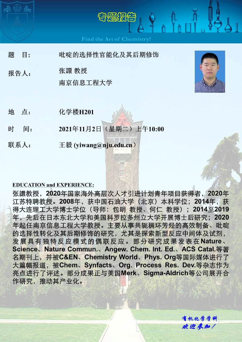 11月2日南京信息工程大学张譞教授学术报告:吡啶的选择性官能化及其后期修饰