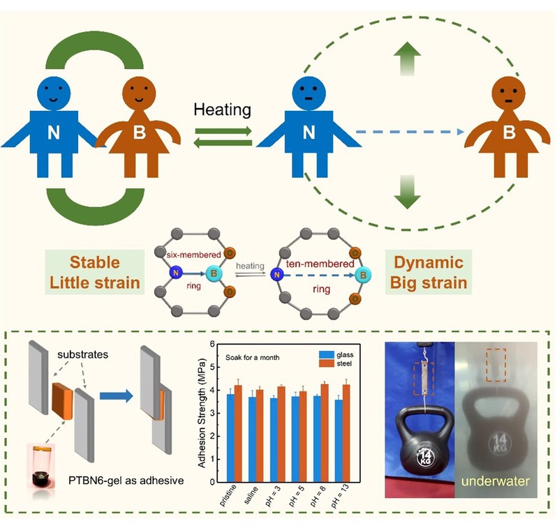 针对硼酸酯分子水敏感性高、遇水易分解的问题,该团队利用分子内B–N配位键与环张力协同作用的策略,设计合成了一种含有分子内B–N配位的六元环状硼酸酯分子BN-6。模型小分子核磁水解实验证明这种六元环BN-6分子具有较高的水解稳定性。同时,由于B–N配位键的热可逆性,BN-6的六元环结构在加热条件下会转变为环张力更大的十元环结构,导致其动态交换行为更加活泼。随后,通过利用BN-6作为交联点合成了一种具有优异粘结强度(4.21 MPa)和可回收的硼酸酯动态交联粘结剂。该粘结剂在水下及强酸、强碱等恶劣环境中展现出极好的粘结稳定性,即使历经长时间浸泡,其粘结强度仍维持在4 MPa以上。该工作有效突破了现有硼酸酯基粘结材料在水下的应用瓶颈,为高稳定性硼酸酯水下粘结剂的设计提供了一种新策略(图2,Advanced Functional Materials. 2022, 32, 220159)。