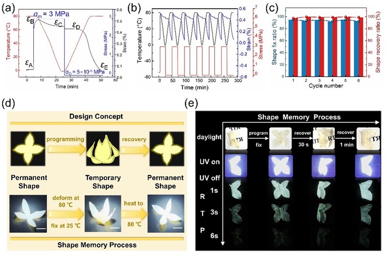 图5. 聚合物材料的形状记忆功能及与RTP功能的联用展示