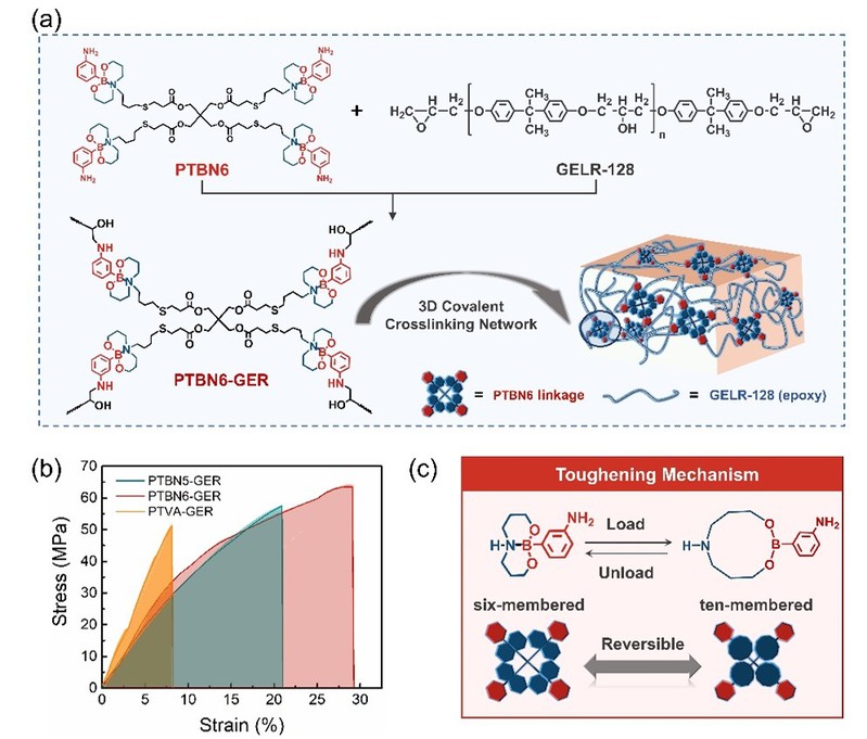图3. (a) 有机磷光聚合物的合成路线及其网络结构示意图; (b) 聚合物材料力学拉伸曲线; (c) 配位键增韧机理示意图
