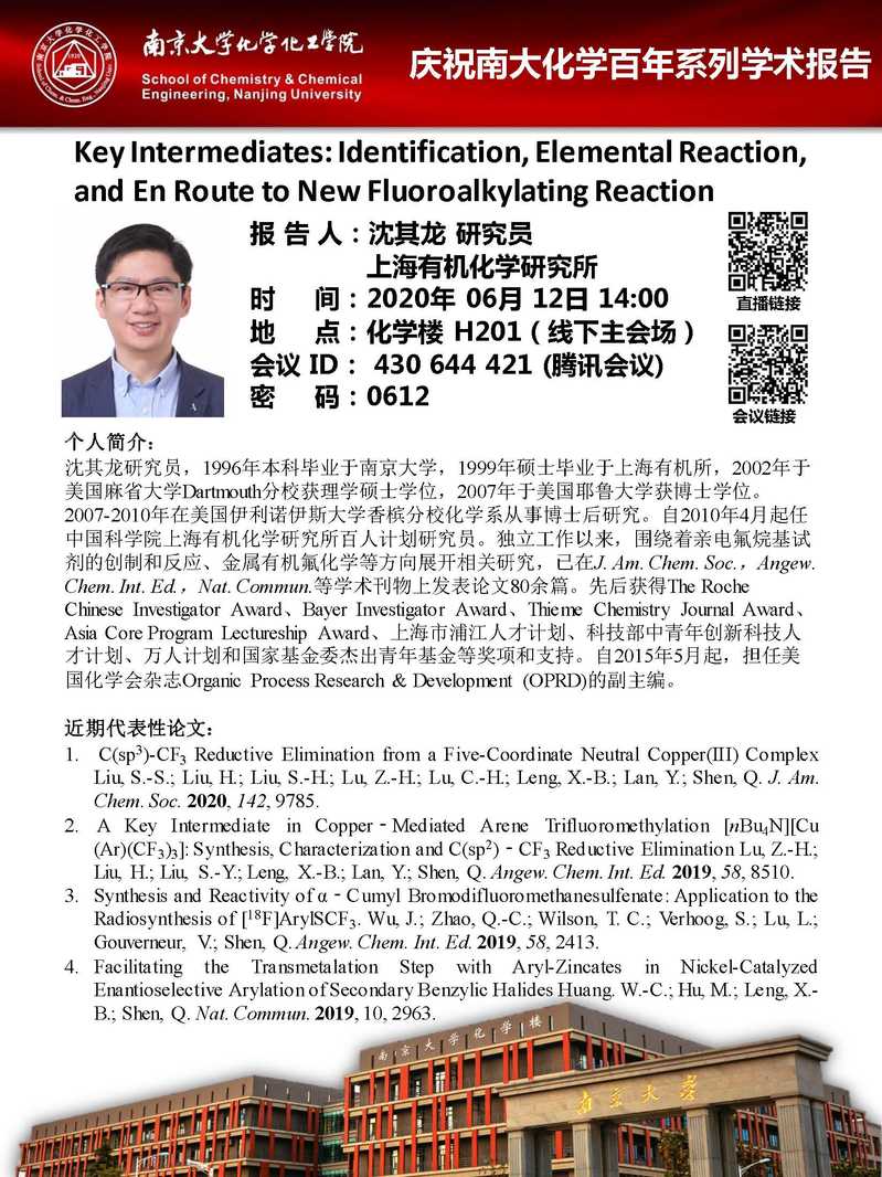 6月12日庆祝南大化学百年系列学术报告-沈其龙 研究员:Key Intermediates: Identification, Elemental Reaction, and En Route to New Fluoroalkylating Reaction