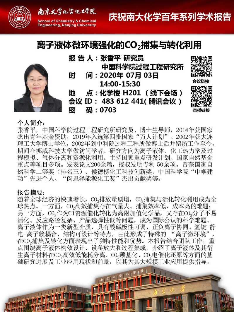 7月3日庆祝南大化学百年系列学术报告-张香平研究员:离子液体微环境强化的CO2捕集与转化利用