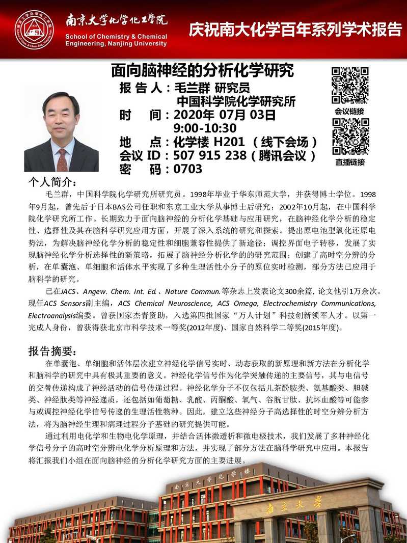 7月3日庆祝南大化学百年系列学术报告-毛兰群研究员:面向脑神经的分析化学研究